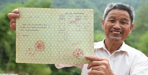 武平县捷文村村民李桂林展示领到的林权证。林善传 摄 山定权、树定根、人定心。 “感谢总书记!林改让我们绿了山包,鼓了腰包。”拿到全国第一本新版林权证的武平万安镇捷文村村民李桂林逢人就说。
