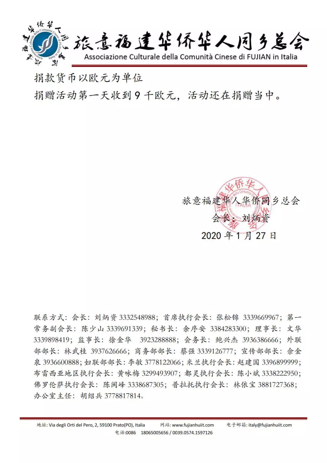 美国福建工商总会纽约 举办为祖国抗击疫情募捐活动 当地时间1月27日,美国福建工商总会在纽约举办“疫情无情、人有情、献爱心”为祖国抗击新型冠状病毒感染的肺炎疫情募捐活动。 现场共捐款72000美元 捐款行动将持续进行中 筹得的款项将用于购买医用口罩 防护镜、防护服等防疫物资寄往武汉 福建,分别由武汉红十字会 福建省侨联接收 并转送至疫情严重地区 目前旅美乡亲可通过拨打以下捐款捐物联络员电话了解捐赠物资的各项事宜: 吴观潮917-592-6588 陈东917-930-1199 林晋佑917-204-4618 郑明棋917-208-2000 美国福建社团为祖国抗击疫情募捐物资 当地时间1月27日 美中经贸科技促进总会 国际海峡两岸文化交流协会联合 在纽约曼哈顿华埠举办募捐活动 活动上宣布将筹捐1万个医用口罩寄回中国 为祖国抗击新型冠状病毒感染的肺炎疫情 贡献一份力量 美国福建侨团联合举办 为祖国抗击疫情募捐物资倡议发布会 现场募集捐款25万美元 闽籍旅日侨团为祖国抗击疫情募捐物资 近日,中国国内发生的新型冠状病毒感染的肺炎疫情牵动着在日华侨华人的心。日本经济文化促进会、日本福州十邑社团联合总会分别发起为祖国抗击疫情募捐物资活动。 社团发出号召后,成员们纷纷响应募捐,两个社团分别有近百名会员参与了捐赠。 据悉,日本经济文化促进会共募捐到30万个医疗口罩,目前已捐赠给武汉市与福建福清市。日本福州十邑社团联合总会将捐款购入一批N95口罩、防护服、防目镜等物资,下一步将捐赠给中国相关部门。 美国闽台总商会等四侨团 向中国武汉捐赠医用手套和口罩 当地时间1月24日 记者从美国闽台总商会了解到 为应对新型冠状病毒感染的肺炎 造成中国武汉医疗物资短缺的现状 美国闽台总商会联合美国华人餐饮业协、 美国福建侨联总会、 美国外卖从业者联合总会 将向武汉捐赠5000副医用手套 2000个口罩等物资 美国两个福建侨社举办 为祖国抗击疫情募捐物资倡议发布会 现场募集捐款约7万美元 当地时间1月26日,由美国福建马尾海外联合总会与旅美福州二十四中学校友联合总会共同主办的“为祖国捐赠医用防护物资倡议发布会”在纽约举行。现场共捐款约7万美元。 美国福建公所在纽约举办募捐活动 驰援武汉抗击疫情 当地时间1月26日下午,由美国福建公所、福建日报社东南网美国站发起主办,多个纽约侨团及公所成员和社团侨领参与的募捐活动在纽约举行。此次现场共捐款约2万美元,捐款行动将持续进行中。筹得的款项将用于购买医用口罩、防护镜、防护服等防疫物资,并转送至疫情严重地区。 为进一步做好募捐工作,旅美乡亲可联系以下方式了解相关事宜: 美国福建公所秘书长曾贤秋347-680-3834 美国连江公会主席郑君国646-662-2212 美国琯头联合总会议长郭绍铨917-215-3383 美国连江二中校友会主席林长秋917-612-0966 阿根廷侨社发出倡议 呼吁侨界为打赢新型冠状病毒防控阻击战贡献力量 近日,湖北武汉等地陆续发生新型冠状病毒感染的肺炎疫情。 武汉以及全国各地医务人员为打赢这场防疫防控战正奋斗在一线。一场应对这一重大突发公共卫生事件的攻坚战已经打响。东南网阿根廷站联合阿根廷福清同乡会、阿根廷三福企业商会、阿根廷福清社团联合会、阿中福清会馆、阿根廷福州十邑同乡会、阿根廷华人超市公会等侨团,向广大旅阿乡亲呼吁,积极为祖国和家乡捐款捐物,为共同抗击“新型冠状病毒感染的肺炎”疫情贡献爱心和力量。 倡议全文如下: 阿根廷侨社关于倡议侨胞为打赢新型冠状病毒防抗阻击战贡献力量的倡议书 近日,中国武汉等多地发生新型冠状病毒感染的肺炎疫情。中共中央政治局常务委员会在农历正月初一召开会议,专门听取新型冠状病毒感染的肺炎疫情防控工作汇报,对疫情防控特别是患者治疗工作进行再研究、再部署、再动员。中共中央总书记习近平主持会议并发表重要讲话。一场应对这一重大突发公共卫生事件的攻坚战已经打响。 疫情的发展和同胞的安危牵动着海内外侨胞的心。广大旅阿侨亲历来素有爱国爱乡、以义为先,勇担社会责任的优良传统。为贯彻习近平总书记重要讲话和中央政治局常委会会议精神,我们倡议: 一、广大侨胞应进一步深刻认识疫情防控的严峻形势,把思想和行动统一到习近平总书记重要讲话和中央政治局常委会会议精神上来,把人民生命安全和健康放在第一位,配合各级政府部门采取更果断、更有力有序、更科学周密举措,有效遏制疫情蔓延。 二、目前新型冠状病毒感染的肺炎疫情形式十分严峻,各类医疗物资极其短缺。我们倡议在阿华侨华人积极行动起来,为应对疫情捐资捐物,医疗物资捐助包括N95口罩、防护镜、防护服、防护眼镜、一次性乳胶手套等。 三、当前疫情防控正处于关键期,专家认为,春节一周期间是“大隔离、大消毒”发挥作用的最佳窗口期,为降低因人员流动带来的疫情扩大风险,我们倡议广大海外侨胞尽量避免因春节回国返乡探亲引起的人员流动,在住在国与国内同胞共同抗击疫情发展。 为响应中国侨联倡议,海内外捐款,可汇入中国华侨公益基金会账户。 华侨基金会接收捐赠账号: 开户名称:中国华侨公益基金会 开户银行:中国银行 北京市分行 东城支行 账 号:3233 5601 8574 开户行号:1041 0000 4747 银行地址:北京市东城区交道口东大街81号 备 注: