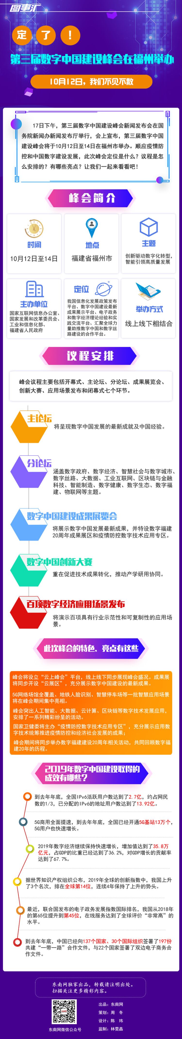 专题页面截图(点击图片查看专题) 东南网9月28日讯 近日,第三届数字中国建设峰会新闻发布会在国务院新闻办新闻发布厅举行,会上宣布,第三届数字中国建设峰会将于10月12日至14日在福州市举办。 今年10月恰逢数字福建建设20周年,本届峰会期间,将同步举办数字福建建设20周年相关活动,回顾数字福建20年的历程,展望数字中国未来。据悉,2019年福建数字经济的总量达到了1.73万亿,占到地区生产总值的40%,增速居全国第二位。同时,福建省数字政府服务指数也居于全国首位。 相约有“福”之州 共享“数字”盛宴! 2020年10月11日-15日,第三届数字中国建设成果展览会将在福州海峡国际会展中心举办。 本届展览会由国家网信办、国家发改委、工信部、福建省人民政府主办,以“创新驱动数字化转型,智能引领高质量发展”为主题,规划数字抗疫、数字福建、主宾省、数字政府、数字经济、数字社会、特色主题七大板块,共展数字中国! 作为福建人关注度最高的峰会配套活动,数字中国建设成果展览会每年都是人气爆棚。在展会上,大家可以一饱眼福,感受最前沿数字科技。在今年这个特殊的情况下,逛展应该如何预约呢? 观众可通过以下渠道报名 报名渠道一:数字中国建设峰会官网 注册步骤: 登录数字中国建设峰会官网首页-选择“观众服务”栏目-点击“观众注册”-输入正确的手机号和验证码-填写个人信息-选择参观日期-点击提交-完成注册 报名渠道二:数字中国建设峰会小程序/公众号 注册步骤: 微信小程序搜索“数字中国建设峰会”-参观注册-输入正确的手机号和验证码-填写个人信息-选择参观日期-点击提交-完成注册 报名渠道三:“e福州”App 在指定栏目根据系统提示进行预约报名 注意事项:根据防疫要求,本届展览会观众入场参观需提前报名注册。观众进入会场需出示注册成功二维码、本人身份证、“八闽健康码”绿码(未成年人入场须有成年人陪同并持有“八闽健康码”)。请配合体温检测,并于观展全程佩戴口罩。 东南网全媒体、多角度报道第三届数字中国建设峰会 9月27日,东南网上线并在网站首页突出位置推出专题《第三届数字中国建设峰会》。专题开设“峰会资讯”“云上峰会”“成果展览”“数字中国”“创新大赛”等多个栏目,通过文字、图片、微视频、图解、海报、H5等融媒体的形式,全媒体、多角度展示数字中国建设峰会进展情况及数字福建建设20年取得的成效、新举措、新愿景。 峰会期间,东南网还将重点关注“数字福建20年”,宣传展示福建在电子政务、数字经济、智慧社会、数字文化、数字生态等方面取得的成效经验,让人民群众感受“互联网+”时代下的更多获得感。 更多精彩内容敬请关注东南网特别报道。【点击查看详情】 >>>更多详情 图解:定了!10月12日!第三届数字中国建设峰会在福州举办