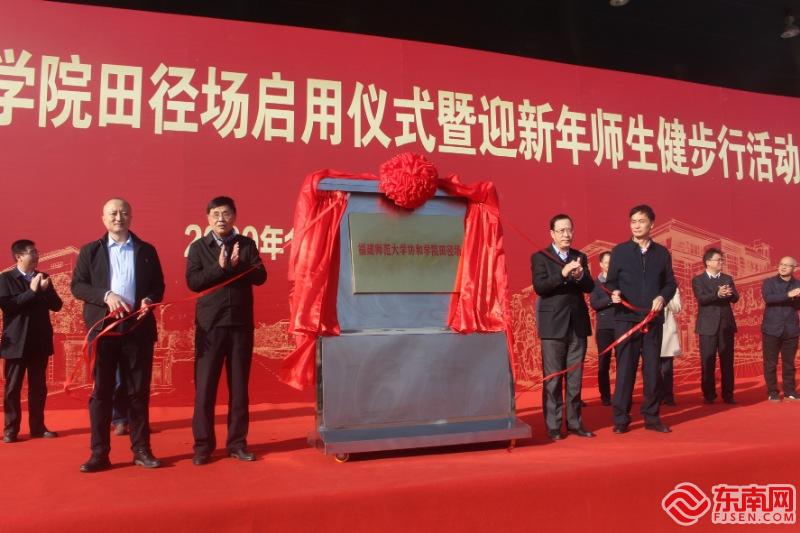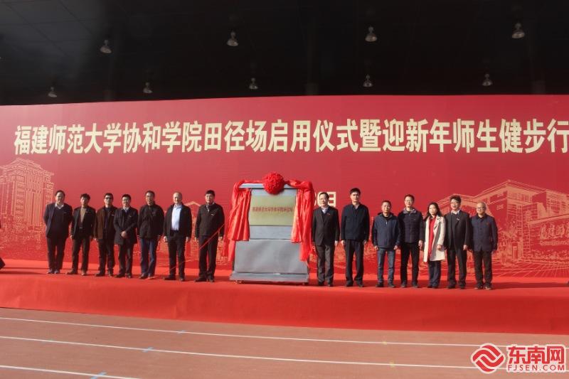 揭牌仪式 东南网记者张立庆 摄 东南网12月30日讯(本网记者 张立庆)30日上午,福建师范大学协和学院田径场启用仪式举行。福州地区大学新校区管委会陈志毅主任、福州高新区管委会林松旺二级调研员,福建师范大学校领导李宝银、王长平、郑家建,协和学院、闽侯县教育局等领导出席启用仪式,并带领师生用健步走的方式辞旧迎新。仪式由协和学院院长张华荣主持。 福建师范大学副校长郑家建致辞中表示,福建师范大学协和学院田径场是在“新时代有福之州、幸福之城”的整体建设布局下启动和推进的,学校还将在推动优质资源共建共享的同时,充分发挥学科、人才、科技、文化综合优势,为加快建设宜学、宜业、宜居、宜游的全国一流大学城贡献福师大智慧和力量。 随后,福州地区大学新校区管委会陈志毅主任、福州高新区管委会林松旺二级调研员、福建师范大学校领导李宝银书记、王长平校长共同为福建师范大学协和学院田径场揭牌。