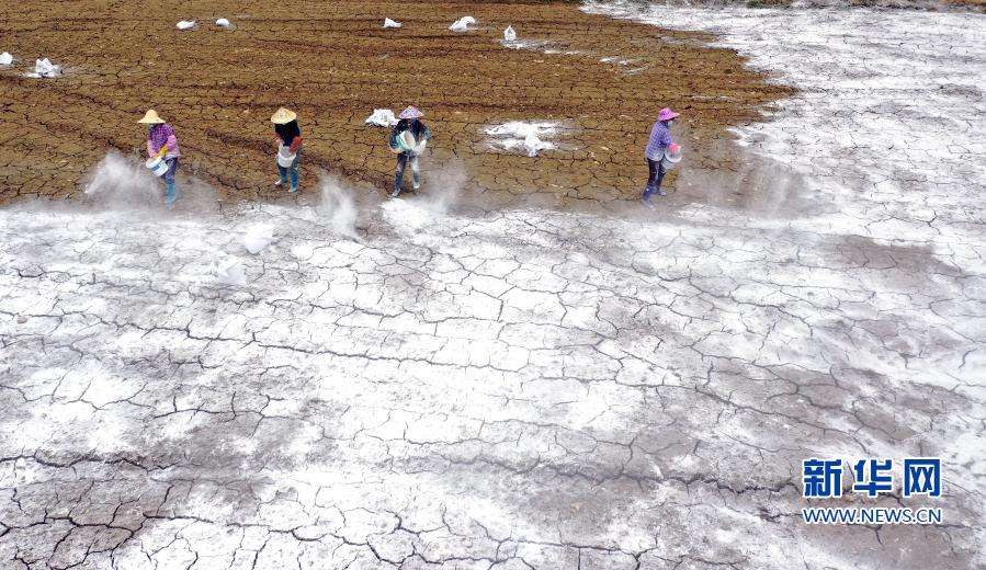 2月3日,顺昌县大历镇田后村农民在高标准农田撒生石灰消毒杀菌(无人机照片)。 2020年以来,福建省南平市顺昌县依托现代化农业高质量发展标准,分类优化提升高标准农田基础设施建设,有效地把山区碎片化地块连成片,改善农田灌溉及耕作条件,完成建设高标准农田1.4万余亩,助推农民增产增收,促进农业可持续发展。 新华社记者 彭张青 摄