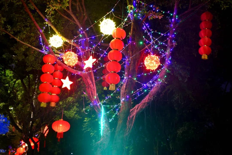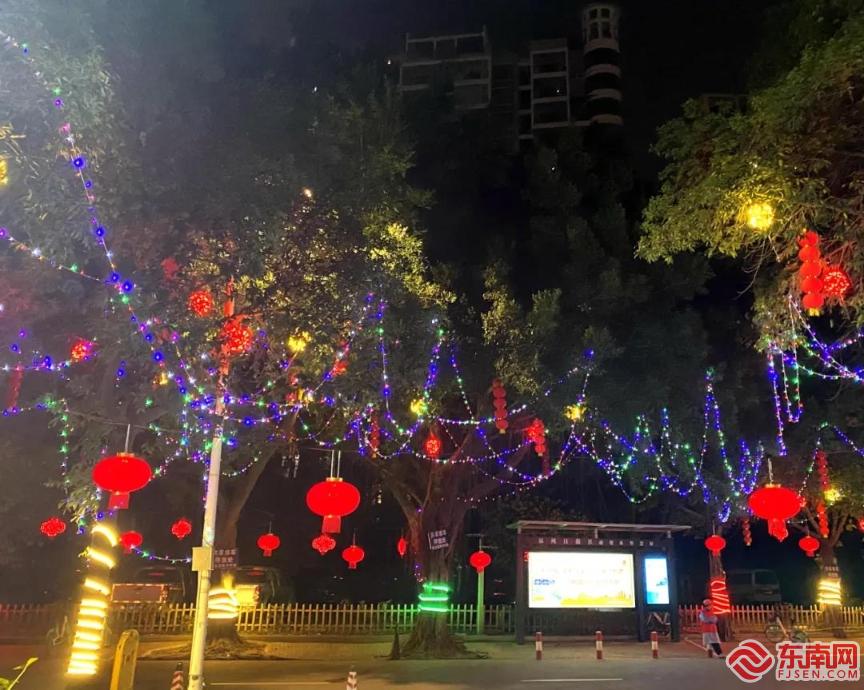 在福州仓山区街边树上也挂起彩灯。林玮东摄