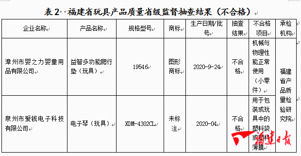 东南网3月1日讯(福建日报·新福建客户端记者 林智岚)开学季到了,学生用品销售成热门,小伙伴们挑选儿童和学生用品的标准是什么呢? 今天福建省市场监督管理局公布儿童和学生用品抽查结果。 近期,依据《中华人民共和国产品质量法》,福建省市场监督管理局组织对儿童和学生用品产品开展产品质量省级监督抽查,抽查产品包括童车、玩具、学生文具。其中抽查童车20批次,学生文具15批次,均未发现不合格。抽查玩具71家企业75个批次产品,其中2批次不合格,不合格率为2.7%, 本次抽查依据GB 6675.1-2014 《玩具安全 第1部分:基本规范》、GB 6675.2-2014《 玩具安全 第2部分:机械与物理性能》、GB 6675.3-2014 《玩具安全 第3部分:易燃性能》、GB 6675.4-2014 《玩具安全 第4部分:特定元素的迁移》、GB 14748-2006 《儿童推车安全要求》、GB 19865-2005 《电玩具的安全》等标准要求,对童车的机械物理性能、燃烧性能、特定迁移元素、增塑剂和电性能等项目进行检验。根据GB 21027-2007 《学生用品的安全通用要求》标准要求,对学生文具的可迁移元素的最大限量、笔的上帽安全、本册亮度(白度)、边缘尖端等项目进行检验。均未发现不合格。