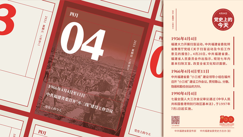 1956年4月4日 中共福建省委批转省教育厅党组《关于扫盲运动及今后工作意见的报告》,指出扫盲工作是一项重大政治任务。4月20日,中共福建省委、福建省人民委员会发出《执行中共中央、国务院关于扫除文盲的决定的指示》,提出了福建省七年内基本扫除文盲、改变全省文化知识面貌的扫盲规划。 1966年4月4日至11日 中共福建省委“小三线”建设领导小组在福州召开“小三线”建设工作会议,贯彻靠山、分散、隐蔽和勤俭创业的方针。 1990年4月4日 七届全国人大三次会议审议通过《中华人民共和国香港特别行政区基本法》,以及香港特别行政区区旗和区徽图案。《中华人民共和国香港特别行政区基本法》自1997年7月1日起实施。 中共福建省委宣传部 中共福建省委党史方志办(宣) |