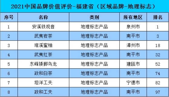 在地理标志产品区域品牌中,安溪铁观音、武夷岩茶分别位列榜首,探花;琯溪蜜柚排名18,武夷红茶排名第32,东峰矮脚乌龙排名第52,政和白茶排名第74,坦洋工夫排名第82,政和工夫排名第97。 据了解,本次品牌价值发布是首次对金融保险业和部分优秀品牌实行主动评价。中国工商银行以3130.12亿元的品牌价值位居企业品牌价值榜首位,中国石化以3085.91亿元品牌价值在能源化工领域排名第一,中国中车以1260.15亿元品牌价值在机械设备制造领域排名第一,贵州茅台酒以3090.15亿元品牌价值在轻工领域排名第一,中国建筑股份以1695.76亿元品牌价值在建筑建材领域排名第一,雅戈尔以295.38亿元品牌价值在纺织服装领域排名第一,山东魏桥创业集团以255.26亿元在冶金有色领域排名第一,首都机场以351.49亿元品牌价值拔得交通运输领域的头筹,海天调味、片仔癀分别以496.71亿元和349.46亿元品牌价值在中华老字号品牌中名列前茅;安溪铁观音、洋河大曲在地理标志区域品牌价值评价中表现抢眼。逐年提升的品牌价值和品牌影响力,印证了中国品牌在推动高质量发展进程中取得的丰硕成果。 据介绍,2021中国品牌价值评价信息发布活动由新华社、中国品牌建设促进会、中国资产评估协会、国资委新闻中心主办。自2013年首次开展制造业品牌价值评价发布,到如今覆盖一二三产业及涵盖部分区域品牌的全面发布,中国品牌建设促进会已经连续八年开展公益性品牌价值评价工作。 |
