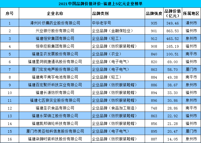 东南网5月10日讯(本网特派记者 陈楠)昨日,2021中国品牌价值评价信息在上海发布。数据显示,福建省兴业银行、恒安集团、片仔癀、圣农发展、恒申控股等企业品牌和安溪铁观音、武夷岩茶等区域品牌价值超过百亿元。42家参评的企业品牌价值达到5亿元以上。 据悉,在此次发布的2021中国品牌价值评价榜中,福建省上榜的总共有56个品牌,其中包括42个企业品牌,8个区域品牌,6个城市品牌。5家企业品牌价值进入“百亿”俱乐部。兴业银行股份有限公司以863.53亿元的品牌价值在此次参评的福建企业中位居榜首,福建恒安集团有限公司品牌价值463.52亿元元排名第二,老字号企业漳州片仔癀药业股份有限公司品牌价值349.46亿元,恒申控股集团有限公司品牌价值165.19亿元,福建圣农发展股份有限公司品牌价值100.51亿元。还有共计42家参评的企业品牌价值达到5亿元以上。 在各自行业中,我省品牌亦是表现不俗。本次品牌价值评价榜单中,我省有多家企业位居所在行业前十。 在企业品牌农业榜单中,福建圣农发展股份有限公司排名跃居第1,品牌价值达100.51亿元;在中华老字号品牌榜单中,漳州片仔癀药业股份有限公司以349.46亿元的品牌价值蝉联第2,品牌价值比上一年提升高达20%; 在企业品牌纺织服装鞋帽榜单中,恒申控股集团有限公司排名第6,品牌价值165.19亿元;在企业品牌金融保险业榜单中,兴业银行股份有限公司排名第7,品牌价值863.53亿元; 在企业品牌轻工榜单中,福建恒安集团有限公司排名第7,品牌价值463.52亿元;在企业品牌电子信息榜单中,福建星网锐捷通讯股份有限公司排名第8,品牌价值69.00亿元。在企业品牌自主创新榜单中,福建泉州匹克体育用品有限公司排名第3,品牌价值54.52亿元;蜡笔小新(福建)食品工业有限公司排名第5,品牌价值28.28亿元;福建青松股份有限公司排名第7,品牌价值20.08亿元。