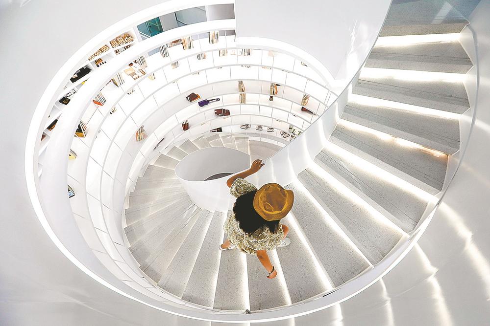 端午节期间,福州市鼓楼区朱紫坊游客中心经重新设计装修后正式开放。其简洁明快的风格和超现代空间艺术设计感,吸引了各地游客前来观赏、拍照,成为福州新的“网红”打卡点。 图为14日上午,一位市民正行走在洁白的旋转楼梯上。 福建日报通讯员 谢贵明 摄 |