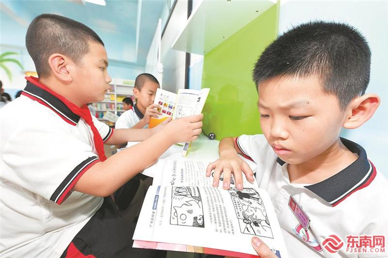 学生在流动图书点前的走廊里阅读。福建日报通讯员 林升 摄 东南网9月8日讯(福建日报通讯员 林升 摄影报道)昨日,在泉州市洛江区实验小学的图书馆里,众多学生前来借书。它已成为学生课间、放学后的“打卡”点。“双减”政策落地后,学生有更多时间阅读课外书。为让学生多读书、读好书,该校通过师生间、学生间相互推荐一本好书,以及举办阅读节、读书沙龙、读书星级明星评比等形式,拓展学生的阅读兴趣。