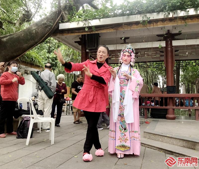 活动现场。东南网记者 林先昌 摄 东南网10月20日讯(本网记者 林先昌)为加强对国家级非物质文化遗产闽剧的保护与传承,弘扬闽都优秀传统文化,19日,福州大学至诚学院信息工程系2020级通信工程学生与福州白马闽剧社老艺人走进鼓楼区洪山镇兴园社区,在斗池老年人活动中心进行了一场以名为“传闽剧文化,誉榕城风采”非遗文化推广活动。 据介绍,当天活动选择的剧目以折子戏为主,有《牡丹亭》《甘国宝》《贻顺哥烛蒂》《梅玉配》《女知府》《红鬃马》《盘关》等,每个剧目都具有代表性曲牌和人物形象。同学们还扮演书生和花旦的角色,参与《牡丹亭》《盘关》小调舞蹈,为曲目润色。 福州白马闽剧社相关人士介绍,通过这样的活动能进一步让同学们对闽剧的传统曲牌及表演、乐器、舞台等都有了更深刻的了解,与大学生携手演绎,还是第一次,此前都是走进幼儿园、小学等,希望今后能与大学生更多的互动交流。 福州大学至诚学院信息工程系2020级通信工程专业参演的学生表示,本次的活动旨在非遗文化的传承并开拓当代青年大学生的视野,让新时代青年对民族的文化根基和特色有了更为深刻的认识与见解,体验非遗文化的魅力,增添非遗文化与时代青年的交流,让中国风深入人心,实现真正意义上的传承与创新。