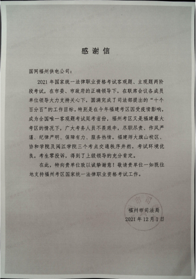 三封感谢信既是对工作的认可,更意味着一份责任与担当。在新的一年,福州亿力电力工程有限公司带电作业分公司将深入贯彻党的十九届六中全会精神,紧紧围绕优化营商环境,持续践行“人民电业为人民”的企业宗旨,在服务用电客户过程中,扎实推进新时代电力“双满意”工程服务举措,立足眼前解决群众“急难愁盼”的具体问题,着眼长远满足人民美好生活对电力的需求,不断增强群众的获得感、幸福感、安全感。