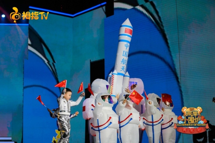 《科技虎送福——福星高照》节目现场 福建电视台少儿频道供图 晚会以云端连线的方式,情牵两岸少年。主会场设于福州,福州市鼓楼第二中心小学、福州市钱塘小学等多所学校的孩子们不仅以音乐情景剧、古典舞等方式表达新春祝愿,还别出心裁地用彩泥“烹饪”出一桌兼具闽台特色的独特“年夜饭”,使其成为舞台上年味满满、别致靓丽的一道风景线。