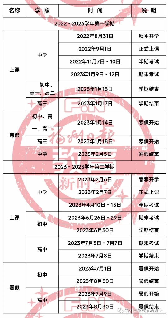刚刚 福州市教育局官网发布 福州市2022-2023学年度 全日制普通中学校历 明确 全日制普通中学 放假时间