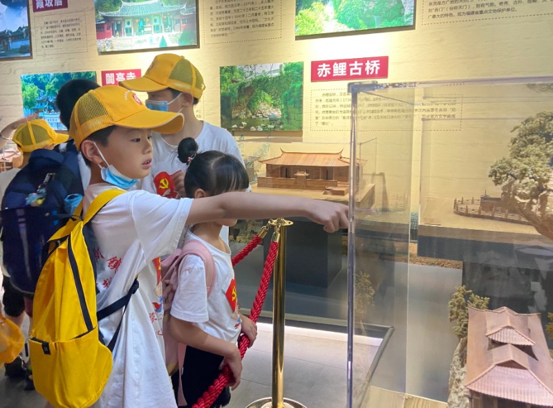同学们参观旅游体验展厅 福州市小桔灯社工服务中心供图 活动现场,社工陪伴小朋友们参观了党员政治生活馆、永阳风情展厅、旅游体验展厅,了解党的百年征程,让小朋友们与过去的家乡进行了跨时空的“对话”,感受了家乡社会人文与环境资源。“永阳寻宝”的游戏,将红色文化与乡土文化进行融合,并将问题答案放置于特定的展点,小朋友们通过协同合作,最终寻找到了“宝藏”。