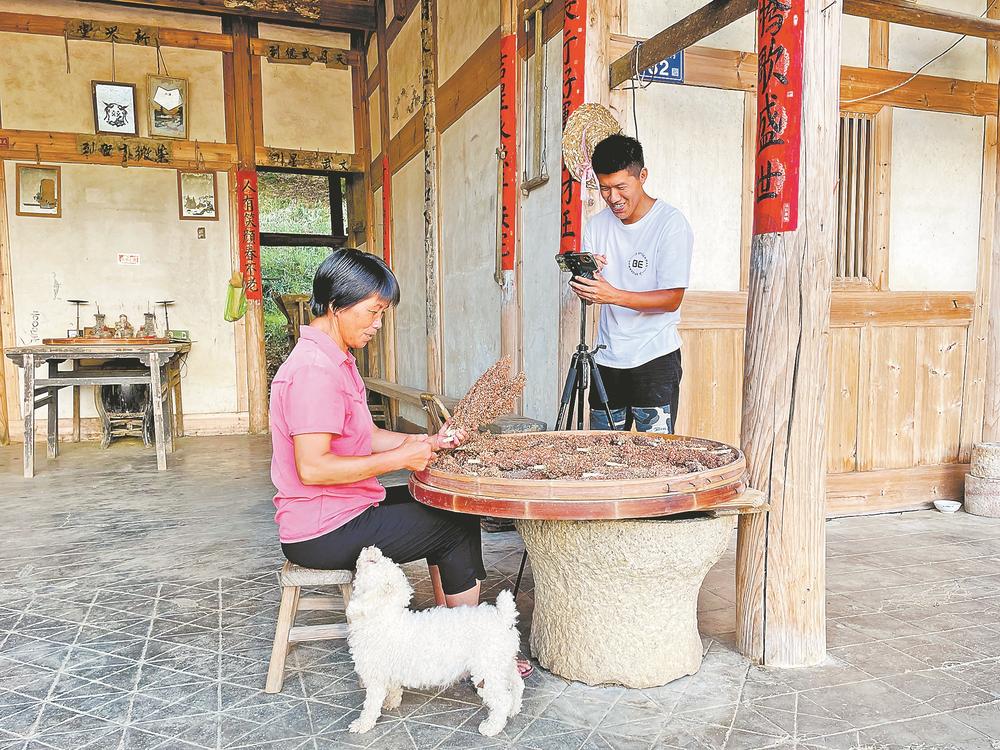 朱春花在筛拣准备酿酒的高粱,小白狗在其脚边嬉戏,吴以校用镜头记录下这一幕。张玥 摄 走红 今年56岁的朱春花,常年务农,偶尔打零工,双手关节粗大、皮肤粗糙。 面对儿子的拍摄邀请,朱春花面露难色:“我一个农村妇女,怎么懂得在镜头前表现自己?我担心拍不好,拖后腿。”但身为母亲,她还是按着儿子的要求,尝试拍了几次视频。 没想到,第一个视频播放量就达到4万次,后来有的视频甚至达到61万次。“母亲对农活和传统手工艺很熟悉,手脚又麻利。”吴以校说,母亲的加盟,让自己的视频终于有了灵魂。 当年12月底,朱春花制作红曲酒的视频被传至YouTube,没几天播放量就达到3万次。不少外国网友在评论区留言,询问红曲酒酿制方法,想要自己动手制酒。 “没想到会有这么多网友喜欢我们的视频。”母亲很激动,拍起视频来也更有干劲,并主动同儿子探讨起视频选题。比如,到了酸枣成熟的季节,她就向儿子建议,可以拍一期制作酸枣糕的视频。 其中,播放量最高的一个视频是《阿嬷做绿豆粉皮,传承百年老工艺,粉皮晶莹爽滑劲道十足!》。该视频中,朱春花一头清爽短发,身着蓝色布衣,在房前屋后洗绿豆、磨绿豆、过滤豆浆、烫绿豆粉皮…… 而在同系列的其他视频中,朱春花根据时节劳作,春天挖野菜、晒笋干,夏天做西瓜酪、仙草冻,秋天酿红曲酒、蒸乌稔饭,冬天腌熏腊肉、制腊香肠。 镜头拉远,伴随着舒缓的笛声,古朴的农家小院浮现于青山薄雾之间,院内种满瓜果蔬菜和奇花异草。朱春花无论是上山采摘,还是回家劳作,总有两条小白狗做伴,小孙子也常常“冒”出来陪阿嬷。镜头中的一餐一饭,让时节更迭具备了美学意义;乡间的日常生活,被笼上了乡愁,让人神往…… 视频中,没有多余的台词或旁白,朱春花一丝不苟地做着手中的活儿,背景只有鸡叫、蝉鸣、狗吠和劳作的原声。在吴以校看来,通过干净、纯粹的声音,引领观众沉浸式地体验田园生活,可以解放观众的感官,让观众感到解压与治愈。 “奶奶带着温度和耐心,用传统方式做事,是世界上最智慧的人之一。”“佩服早期传统农人的智慧,利用腌制的方式来保存食物,还能变化出各种料理,真的很不简单。”“阿嬷真是本活历史,视频内容丰富,让人想一直看下去,谢谢阿嬷!”…… 吴以校和朱春花的视频引起国内外网友的共鸣,身处盖竹村的母子俩也感受到来自全世界的温暖。 探究 盖竹村面积1.3万亩,森林覆盖率高达90.6%,是国家级生态村。500多名村民中,有五分之四在外务工,留下100多名老人守着老屋。 “村民们认为,没本事待城里,才要回农村。”吴以校说,在田间劳作一辈子的老人们,没接触过新媒体,并不理解拍摄这些视频的意义。 在梅山镇一所小学当教师的舅舅也常来劝导,让他找份稳定的工作。 但一头扎进短视频拍摄的他,并不在乎别人的看法,而是将更多时间用于探究如何提升视频流量。 “玉林阿婆”“广西一婶”……他认真对比同类型不同账号的拍摄模式,研究评论区中的建议,提升拍摄、剪辑技巧,调整文案策划和拍摄节奏。 有网友指出视频里缺少生活气息,吴以校就增加了邻里互动、孩子帮忙等更生活化的场景;有网友表示村里风貌出现得太少,他就尝试将村景和村民更多地植入视频中…… 几个视频爆火后,吴以校又开始思考、总结观众究竟喜欢何种视频。 “城镇化的快速推进,让一些农村景观逐渐消失。观众想要的是一种乡土味道,他们尝试在呈现原汁原味乡村生活的视频中,寻找儿时记忆和情感寄托。”他分析道。 视频传递的正能量,也是吸引观众的关键因素之一。 “美食和手艺,本身就是文化价值观的载体。此外,视频中体现的和睦的邻里关系、爱老慈幼的美德,都是国内外观众一致认同的精神品质。”他认为,内容为王,做视频就要往更深层次去做,触及精神层面,这才能体现视频的价值。 变现 流量如何变现,是摆在吴以校面前的必答题。 “如果视频播放量高,便于平台插入广告,该视频就能从平台获得更高的收益。”吴以校说,目前,他每三天在各大平台更新一次视频,内容持续输出让自己有了相对稳定的收入。 据统计,“闽湖阿嬷”在各平台现有粉丝约30万名,年龄大多在18~55岁,女性占七成。有一些美妆、美食广告商私下找过他,但他只在母亲节时接过一次电子按摩枕和护眼仪的广告,“广告一定要符合我们的定位和人设”。他也尝试过带货,但只卖过自家的蜂蜜,“自家的东西才能确保质量”。 随着账号走红,他每月能从中获得3万元左右的收入。他在县城买了房,“自媒体创作者”这个新潮身份也逐渐得到乡亲们的认可,有些村民还加入拍摄。 70岁的村民陈玉财,人称“阿财公”,是个手艺人。村里漫山遍野的竹子,在他手下可以变成竹篓、酒篓、簸箕等生活器具。吴以校邀请他和母亲一起在镜头前编织竹篓等。没想到,有他出现的视频都火了。 当然,吴以校也引起一些“键盘侠”的质疑。 有人质疑视频不是他自己制作的,而是“公司的套路产物”。“我就靠两部手机、一个脚架拍摄,自己剪辑,哪有团队呀?”刚开始,他满腹委屈,试图在网络上一一解释,“现在看开了,网友的猜疑实际上反向证明了我的拍摄和剪辑水平”。 还有人质疑其视频拍摄农村传统耕作生活,呈现的是“落后”的一面。“这明明是饱含乡土气息的乡村美学,再现了区别于城市钢筋水泥的乡村生活,展现
