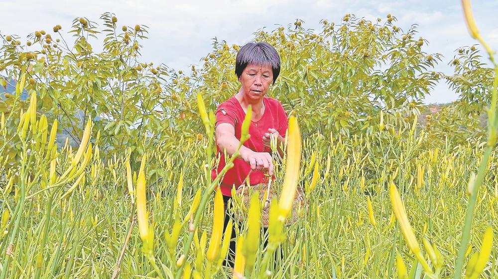 朱春花在采摘黄花菜。叶紫妍 徐文锦 摄