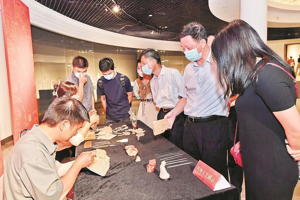 观众在展厅参观软木画和石雕工艺展示。(记者 吴鹏 摄)