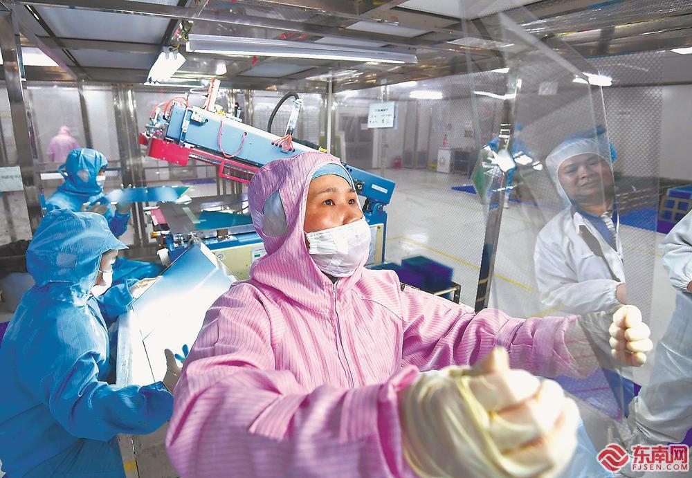 连城工业园区中触电子公司千级洁净车间,工人在生产85英寸超大尺寸触摸屏产品。中触电子是全国大尺寸触摸屏与汽车专用触摸屏领域行业领军企业,也是福建省制造业单项冠军企业。福建日报记者 游庆辉 摄