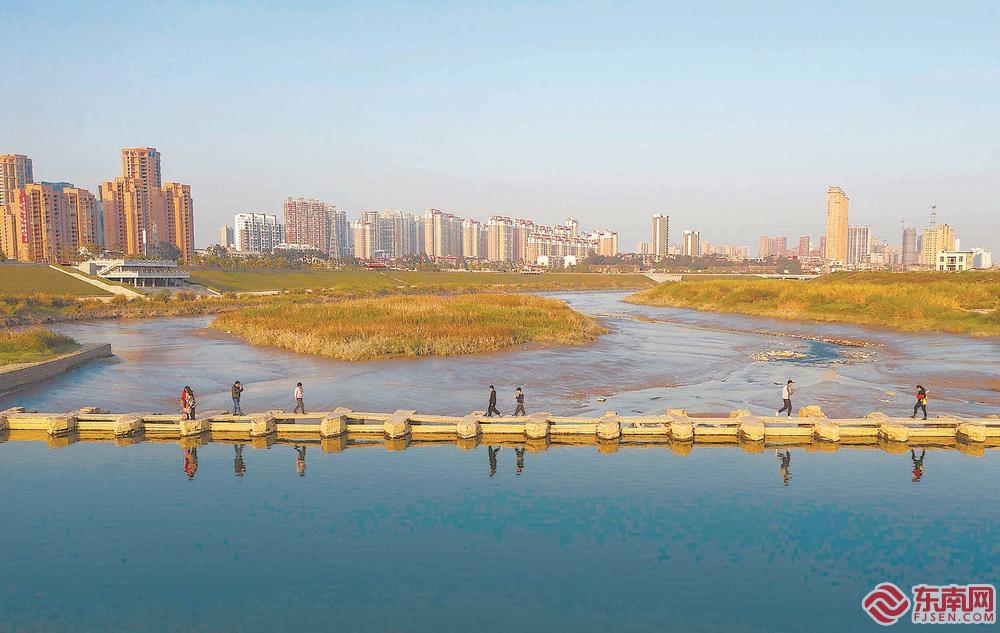 游客们行走在莆田木兰陂上,感受岁月的沉淀、自然的神奇。从水患之河到幸福河湖,木兰溪治理成为新中国水利变害为利、造福人民的范例。福建日报记者 王毅 摄