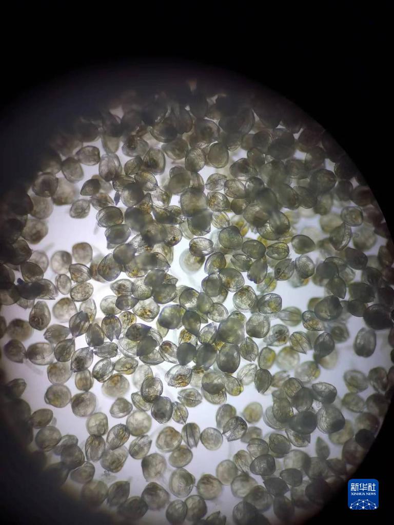 这是12月9日在莆田市秀屿区平海镇的一家贝类育苗场拍摄的花蛤苗种(显微镜照片)。