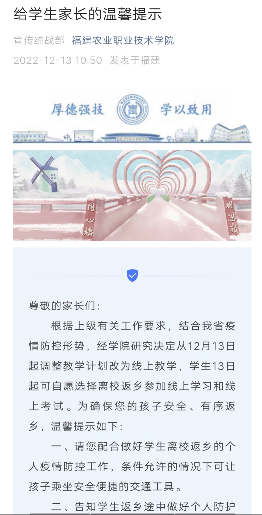 2022-12-13 14:08:41 来源:东南网 责任编辑:陈玮 作者:张立庆东南网12月13日讯(本网记者 张立庆)近日,网络上流传一份有关福建高校调整优化期末教学安排相关提醒,记者向福建省教育厅证实,确有此提示函。《提示函》表示,高校要迅速调整期末教学和考试安排,尽快安排学生离校返乡,最迟于12月16日(周五)要让有返乡意愿的学生全部疏解离校返乡。记者从部分高校获悉,从12月13日起,调整教学计划改为线上教学,学生13日起可自愿选择离校返乡参加线上学习和线上考试。 福建农业职业技术学院官微发出《给学生家长的温馨提示》 图片来源:福建农业职业技术学院微信公众号 12月13日上午10:50,福建农业职业技术学院官微发出《给学生家长的温馨提示》一文,文中明确:根据上级有关工作要求,结合我省疫情防控形势,经学院研究决定从12月13日起调整教学计划改为线上教学,学生13日起可自愿选择离校返乡参加线上学习和线上考试。为确保您的孩子安全、有序返乡,温馨提示家长:配合做好学生离校返乡的个人疫情防控工作,条件允许的情况下可让孩子乘坐安全便捷的交通工具。告知学生返乡途中做好个人防护工作,乘坐公共交通工具时请全程佩戴好口罩。注意防范诈骗,注重交通安全,不乘坐无证无牌交通工具。学生返乡后提醒学生做好线上学习,及时参加线上考试,认真完成本学期的学业。学生返乡后,提醒孩子保持良好的个人卫生习惯,外出时科学规范佩戴口罩,勤洗手、不扎堆、少聚集,保持合理的社交距离。 此外,记者从福建其它多所高校获悉,从今日起,已经停止线下教学,学生可于12月13日下午起至 16 日,可有序返乡。参加研究生入学考试、选调生考试等学生可留校至考试结束后返乡。近期刚返校的新疆、西藏学生可根据本人意愿决定是否离校,需留校的提交申请。其他情况确需留校的学生经申请审批后可留校,留校学生应遵守学校相关管理规定。不过一些学校表示,学生虽然可以离校返乡,但学校线上教学、期末考试安排仍在研究中,学生返乡后仍需做好线上学习、线上考试。 |