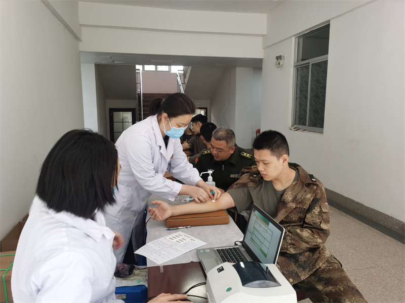 龙岩军分区为群众开展义务诊疗。福建省军区政治工作局 供图 活动现场,义务诊疗队对市民进行健康咨询、测量血压、血糖检测和常见病诊断,宣讲疾病预防和保健常识,帮助群众提高健康意识、养成良好习惯。征兵宣传队还借此机会,在现场解读应征入伍政策,发放征兵宣传手册,发动市民鼓动适龄青年报名参军,取得了较好效果。
