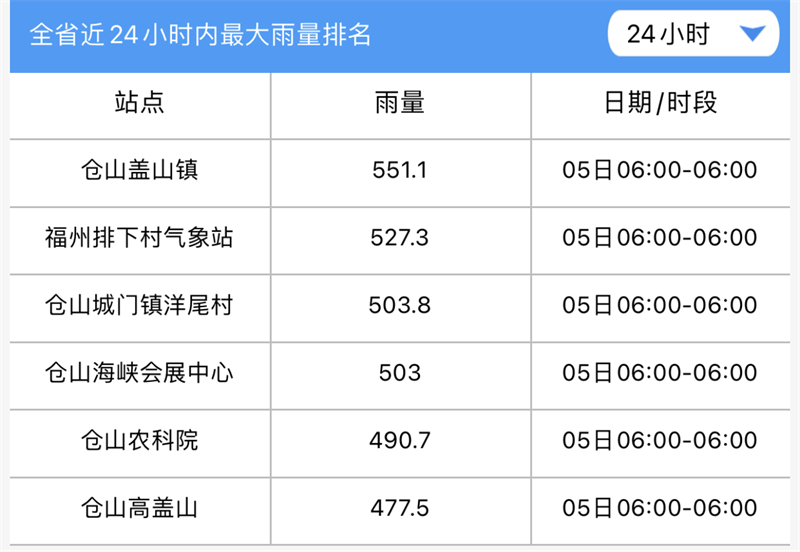 福州仓山区盖山镇24小时降雨量达551.1mm
