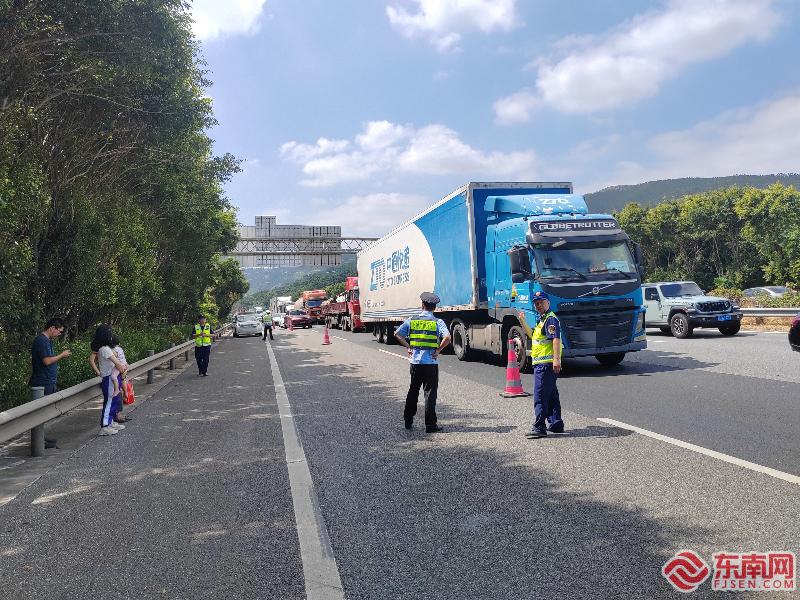 2023-10-05 08:18:49 来源:东南网 责任编辑:陈玮 作者:胡佳楠 叶卢苗艺东南网10月4日讯(通讯员 胡佳楠 记者 叶卢苗艺)两节期间,福建高速执法队伍坚守在岗,尽心尽责,高效处置各类应急突发事件,及时为过往车户群众排忧解难,全力营造安全畅通的节日出行环境。 多车追尾致道路拥堵,执法员快速做好安全保障工作 “非常感谢你们,宝宝不宜长时间暴露在太阳底下,你们考虑得很周到!”10月2日在莆田收费站外广场,一名女士连连对执法人员的贴心服务表示感谢。 当天上午11时许,莆田高速执法支队一大队黄石中队执法人员在路面巡查时,发现沈海高速BK2168+400处车辆行驶缓慢、道路拥堵,执法人员当即判断前方很可能发生了交通事故。行驶至现场时,发现有6-7辆小车追尾,事故占据了第4车道和应急车道。现场车流量非常大,为尽快缓解拥堵,执法人员立即参与到事故处置行动中。