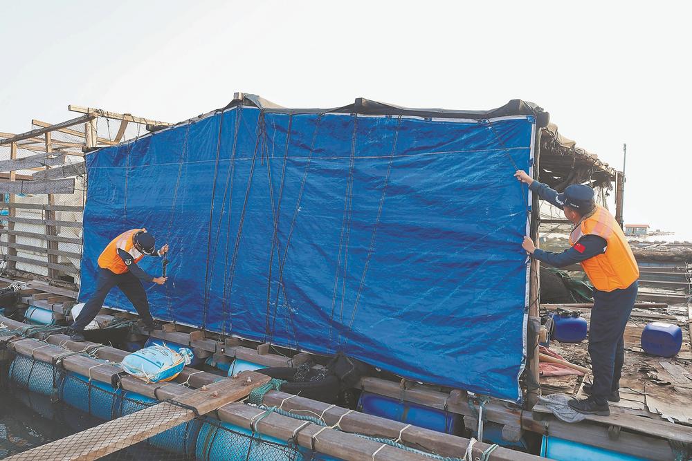 今年第14号台风“小犬”于5日8时20分前后以强台风级在台湾省屏东县鹅銮鼻登陆,登陆后减弱西行。作为秋台风,“小犬”给我省带来风雨影响,尤其在风的方面较为突出。日前,漳州海警局执法员赴辖区各重点海域,开展防台风宣传和安全检查。图为漳州海警执法员在帮助渔民固定渔排天遮。 福建日报记者 游庆辉 通讯员 蔡晓晔 摄 |