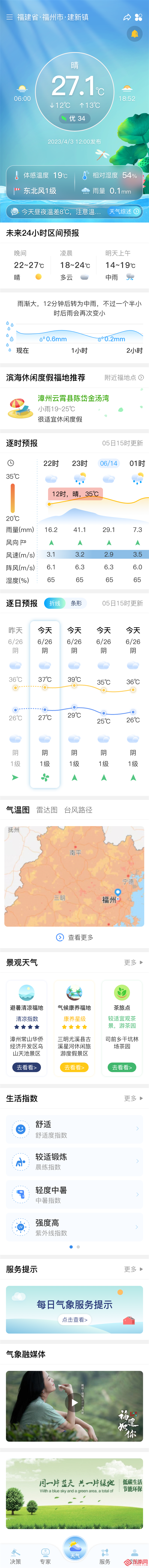 “知天气”第四屏包含丰富的气象信息,供各行各业人士参考。 专业人群的“风控大师” 今年,受台风“杜苏芮”“海葵”等侵扰,疾风骤雨给我省各行各业造成极大不便。上一版“知天气”直观展示台风路径、风力风向等内容,及时为社会生产提供防灾减灾信息。新版“知天气”专业内容更加全面、集中、直观,用户只需轻点客户端第四屏,便可看到“农业气象”“旅游气象”“交通气象”等资讯模块化展示。 但“知天气”并不只是将各项监测数据简单罗列,而是在数据基础上以其气象专业性提供预警和建议。各类气象情报、预报、专报等点击即看,操作逻辑相当简单。“新版‘知天气’集成的监测数据更多、更详细,因此预警信息、生产建议也更精准可靠。”汪春辉介绍,3.0版“知天气”集成了福建省内2100多个气象监测站的数据,而4.0版已超过2500个。 “这些及时、准确、精细的气象服务信息完全是公益性的,任何手机用户只要通过简单的注册和登录,就可以获取。”省气象服务中心首席服务专家黄志刚强调,“知天气”的首要任务是服务社会,让居民生活更加便利,社会生产活动更加安全和高效。