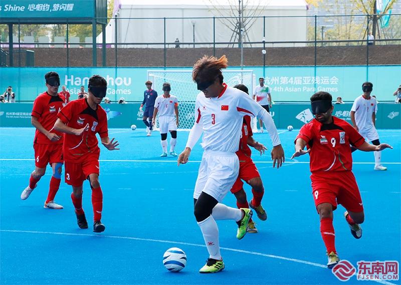 10月28日,中国队球员朱瑞铭(11号)在盲人足球决赛中拼抢。东南网特派记者 陈娜 摄