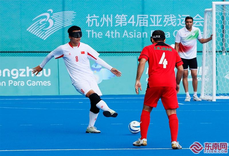 10月28日,中国队球员朱瑞铭(左)在盲人足球决赛中射门。东南网特派记者 陈娜 摄 |
