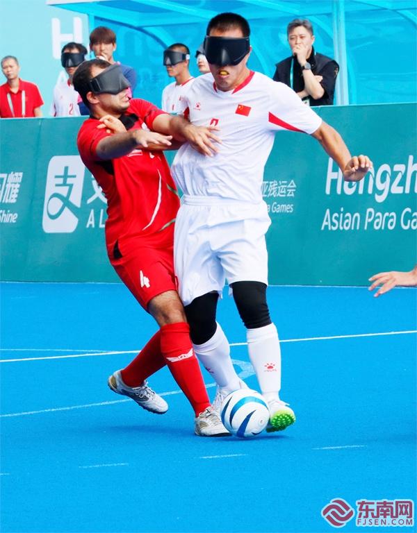 10月28日,中国队球员俞裕锬(右)在盲人足球决赛中拼抢。东南网特派记者 陈娜 摄