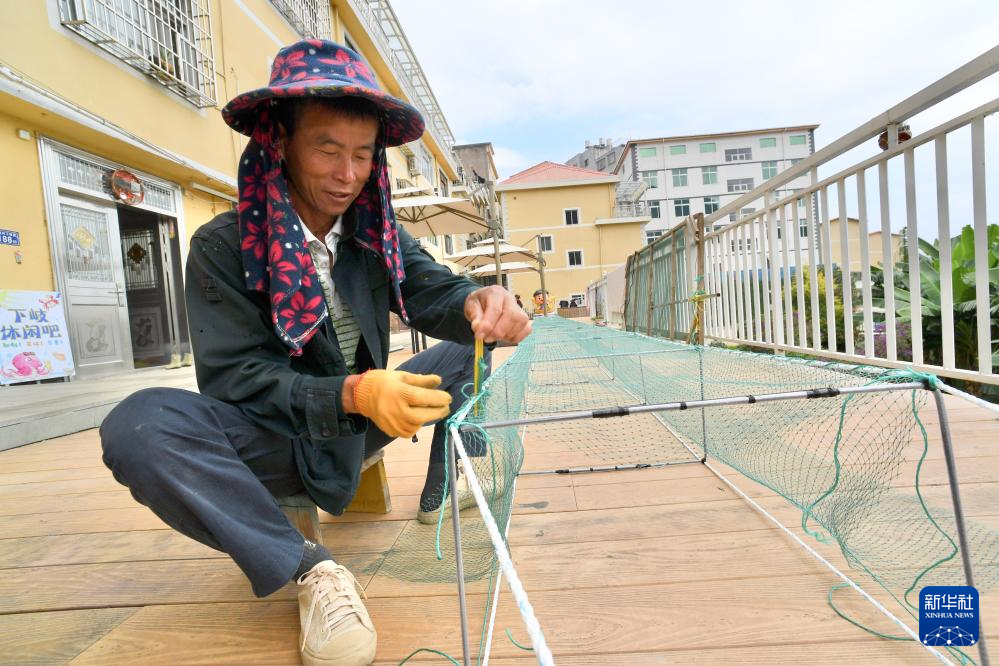 11月15日,下岐村村民在编织捕鱼的渔具。新华社记者 姜克红 摄