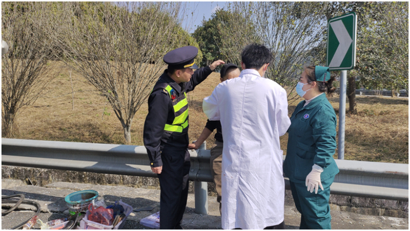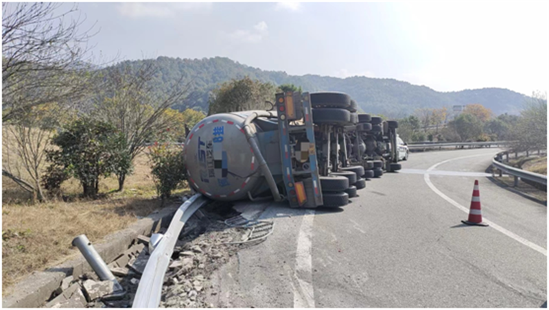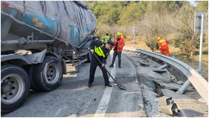 当日11时25分左右,南平高速执法支队松溪中队接到路网中心通报后,立即赶赴现场。只见一辆重型半挂牵引车货车侧翻在主车道、应急车道之间,侧翻车辆压塌部分水泥路基和波形护栏,运载的煤灰部分洒落在路面上,覆盖面积约50多平方米。由于发生事故地点处于匝道拐弯处,来车视线极度有限,易引发二次事故,经交警研判,决定对该匝道采取交通管制,暂时停止车辆从郑墩收费站驶入高速公路。随后,执法员对有轻微皮外伤的司机进行简单消毒、包扎后交由稍后赶至的120急救中心作进一步检查治疗。