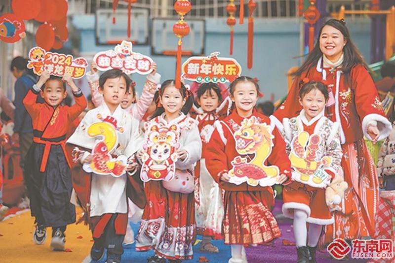 29日,福州市鼓楼区鼓西街道新晖幼儿园举办“福娃迎新年”游园嘉年华活动。活动中,文化志愿者和孩子们身穿传统服装,共同快乐体验投壶、打年兽、甜甜棉花糖等趣味闯关活动,感受传统民间游戏魅力,迎接新年的到来。谢贵明 摄
