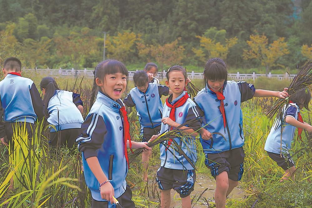 “朱子课堂活跃在田间地头”亲子活动现场,家长和孩子一起割水稻。