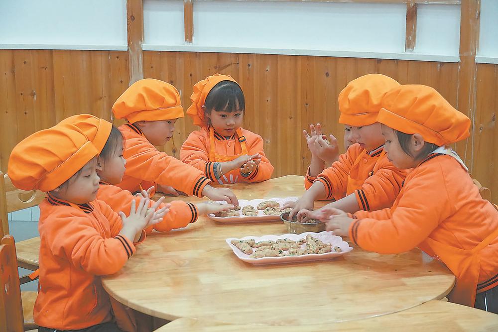 武夷山市实验幼儿园的小朋友在制作“文公菜”。