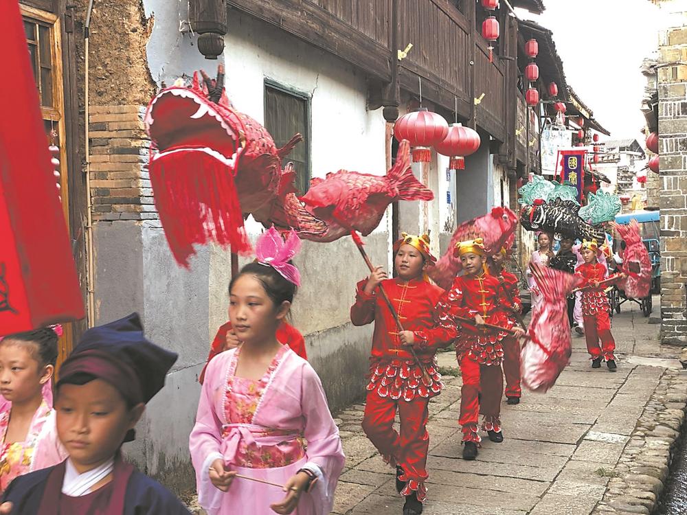 武夷山市朱子学校少年龙鱼表演队在当地兴贤古街表演龙鱼戏。