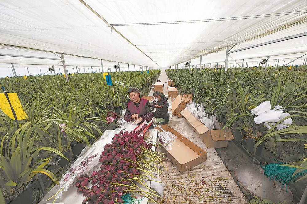春节前夕,一个大花蕙兰种植基地,花农将大花蕙兰鲜切花套上袋子,销往外地。 |