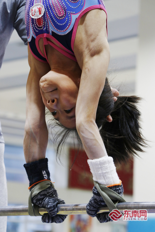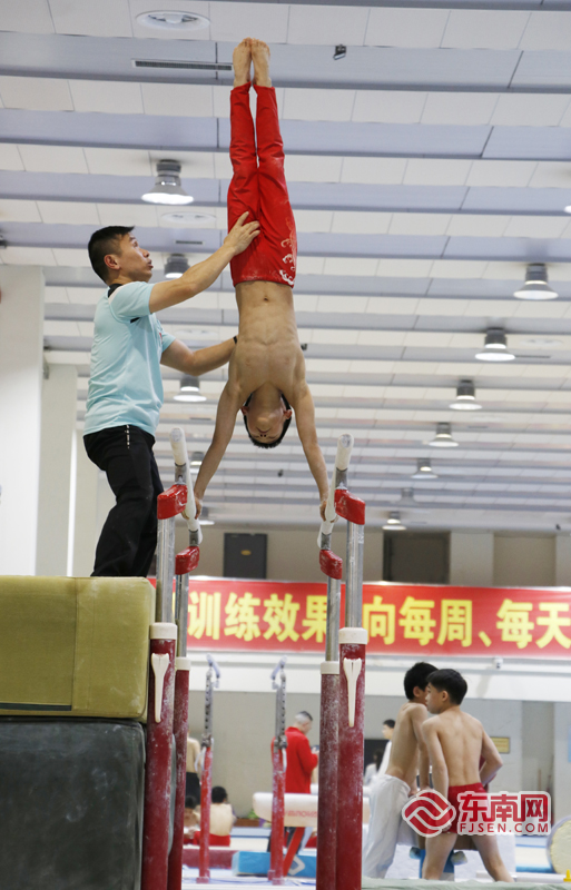 在冬训中,辅助训练必不可少。图为运动员进行辅助训练。东南网记者颜财斌 摄 “一个新动作学两到三年是常态。”罗峰说。由于体操不是对抗性比赛,在赛场中直接展现的是一名运动员的训练状态和训练成果。即便了解竞争对手的成套动作和技巧难度,但是运动员也很难完全复制别人的成功经验,更多的是与过去的自己进行比较。“对于新动作不是死磕,也有可能是火候不到,或者时间不够。”她说,当难度动作放到训练中,运动员不可能一学就会。“不然,我们干嘛365天都练这个动作?”她笑着说。 “也会想家,习惯就好了” 与林奕辰等一众小将们不同,陈凤已经入队训练7年,对于春节不能回家的训练计划觉得“正常”。“我第一次在队里过年,也会想家,习惯就好了。”在她看来,在大集体过年,也很有气氛。 在第一届全国学生(青年)运动会,陈凤摘得体操女子甲组全能决赛金牌。在本次的冬训中,她有了更新的目标,因为她即将迎来个人首个成人赛。“希望自己第一次和姐姐们比成年赛,拿个好成绩。”训练场上,陈凤神情严肃,对每个动作都追求突破。罗峰也是时刻关注着陈凤的每个动作。 “别背腰。做动作的时候背腰,可不就‘躺’在杠子上。”当运动员在器械上进行训练时,教练还得化身安全员,时刻盯着运动员们在训练场上的状态。在罗峰与记者对话的过程中,她的眼睛不曾离开器械上的运动员,对话也不时中断——因为她需要随时指导运动员进行动作调整。