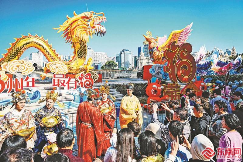14日,福州仓山区举办的“福满仓 迎财神”活动在烟台山景区周边举行。在陈靖姑故居的财神民俗巡游队伍的带领下,五路财神一一给商家送去新春的好福气、好财气。福建日报记者 游庆辉 摄 |