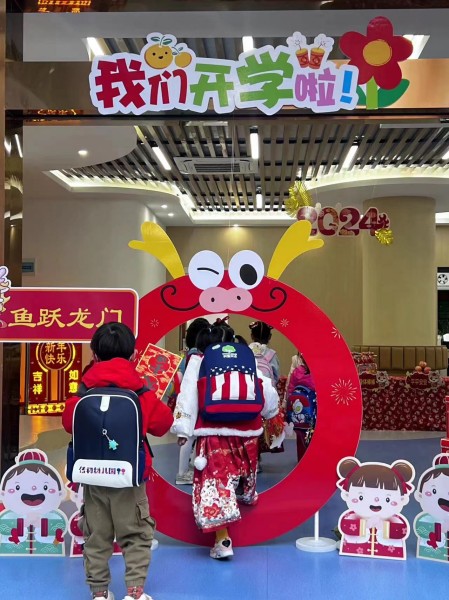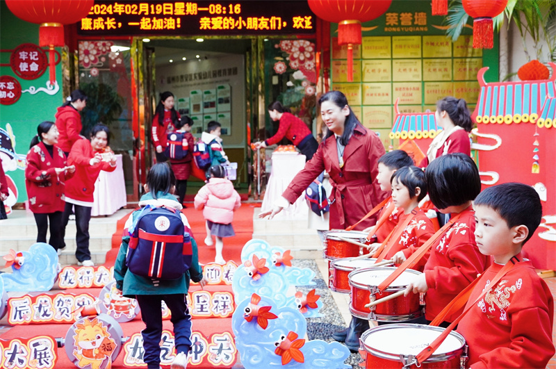 2024-02-19 20:46:43 来源:东南网 责任编辑:陈玮 作者:冯川叶东南网2月19日讯(本网记者 冯川叶)今日,福州各小学和幼儿园迎来了开学第一天。不少学校都装扮一新,喜气洋洋迎接新学期的到来。 晋安区实验幼儿园教育集团:萌娃跨龙门 红包寄祝福 晋安区实验幼儿园教育集团在孩子们的欢声笑语中,共同迎来了充满活力与希望的2024年龙年新学期,开启新学期“鱼跃龙门”新篇章。 金龙献瑞,象征着新一年的吉祥如意;鼓声震天,敲响了对孩子们无限期待与祝福的乐章。在晋安区实验幼儿园总园里,园长和老师亲手将满载祝福的新年福橘和幸运福卡赠予每一个孩子,寄寓龙行大运、喜气洋洋的美好愿景。萌娃跨龙门,红包寄祝福,这场别开生面的迎新接福仪式更寄托了幼儿园对孩子们无尽的关爱与期盼。