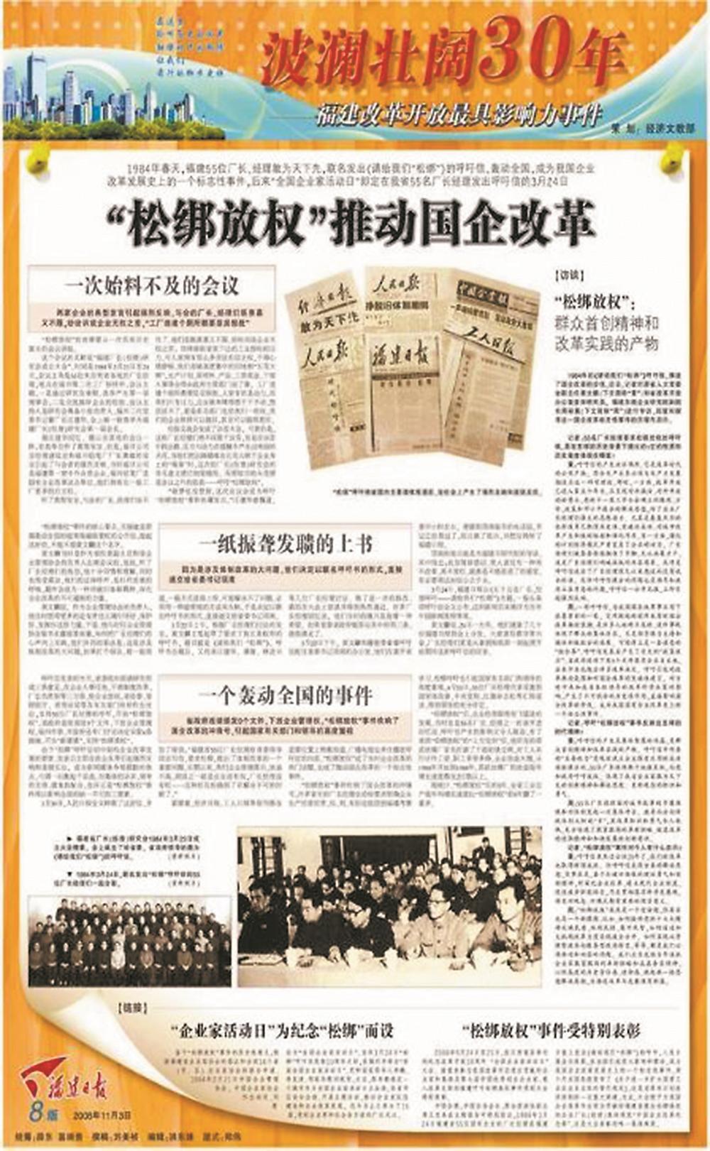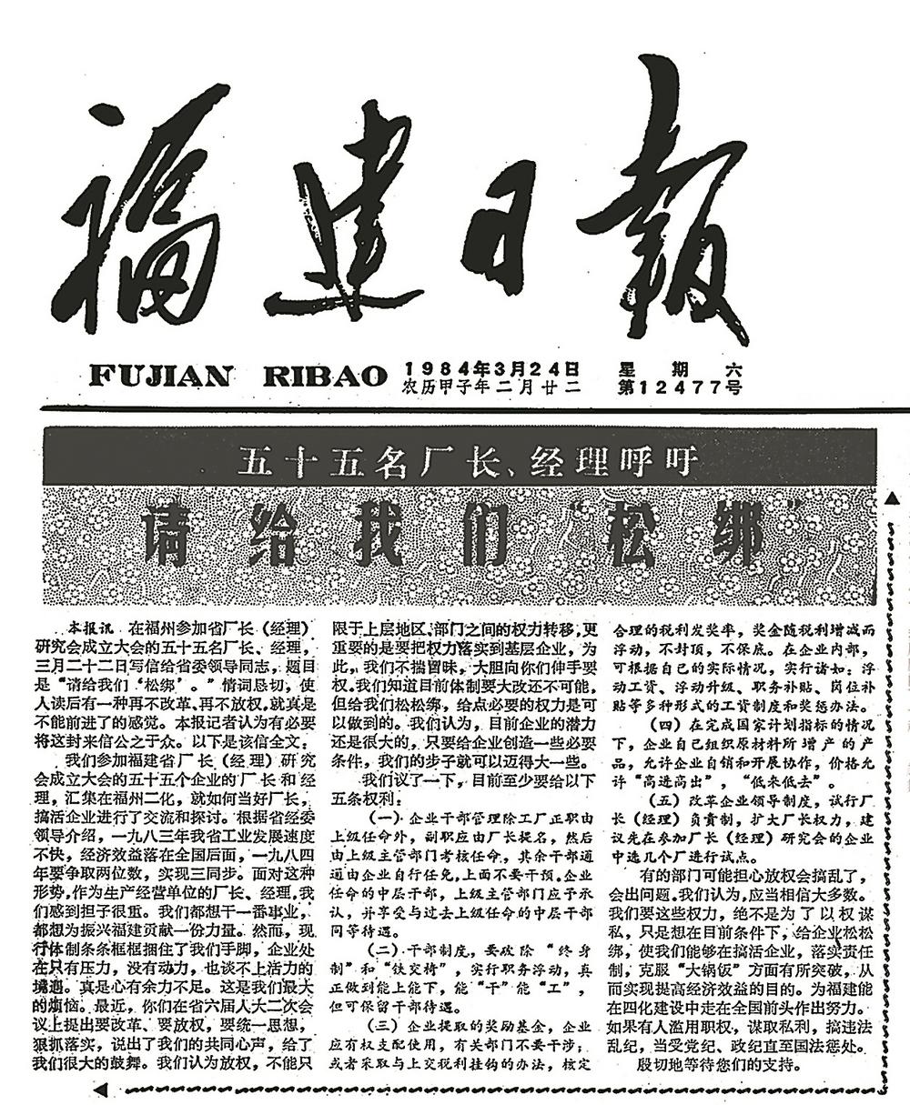 55位厂长经理联名呼吁,成就了我国经济体制改革的一段佳话。福建日报关于“松绑”放权的报道,也成为党报推动改革的成功范例,曾连续两年获得全国新闻最高奖。