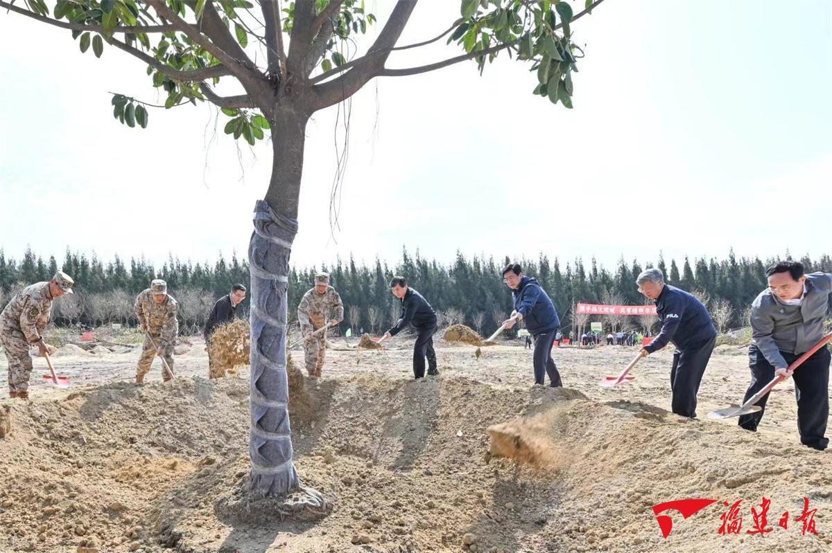 东风暖阳,春与人宜。3月25日,省委书记、省人大常委会主任、总林长周祖翼,省委副书记、省长、总林长赵龙,东部战区陆军司令员孔军,省政协主席滕佳材等来到福州新区滨海新城沿海防护林地块,参加主题为“开展植树造林、共建绿色家园”的义务植树活动,与干部群众一同植下高山榕、宫粉紫荆、台湾相思等树苗。随后,省领导赴福州新区管委会,召开省委理论学习中心组学习会,深入交流学习贯彻习近平生态文明思想的心得体会。