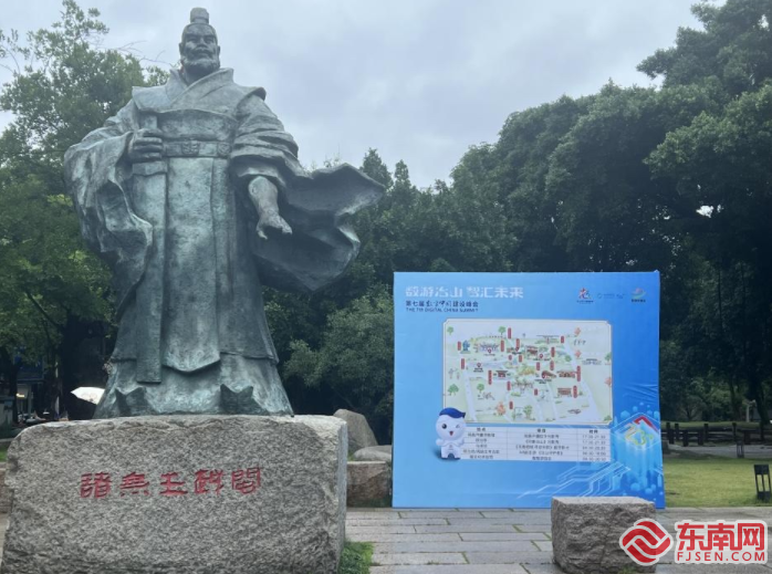 闽越王无诸像前,游客入园扫码即可集福明信片。东南网记者 陈楠 洪振威 摄
