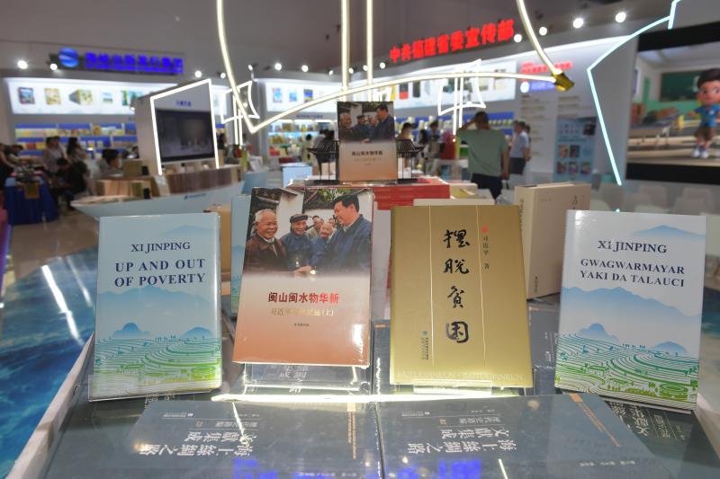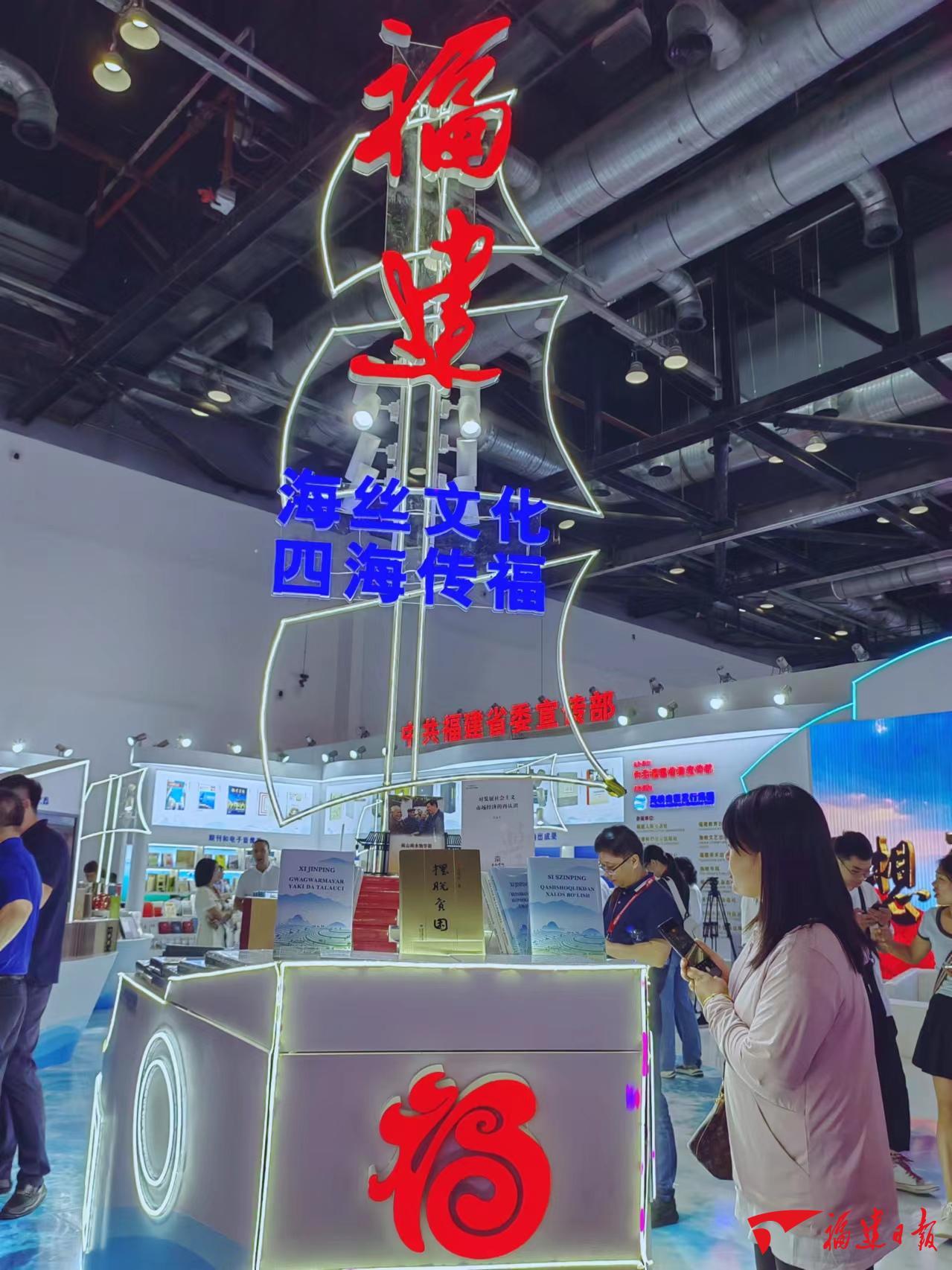 走进福建展区,一艘别致的福船映入眼帘,船头上印着鲜艳的“福”文化标识,桅杆顶部书有红色的“福建”二字,下方写着八个蓝色大字:“海丝文化 四海传福”。福船上满载着以主题出版为代表的精品图书,包括《摆脱贫困》多语种版本和《闽山闽水物华新——习近平福建足迹》《海上丝绸之路文献集成·历代史籍编》《台湾通史》(连横译注本)等书籍。