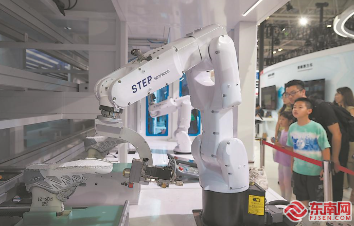 前不久,在福州举行的第七届数字中国建设峰会上,电信展区内的工业机器人正在对鞋面进行喷胶。福建日报记者 施辰静 摄