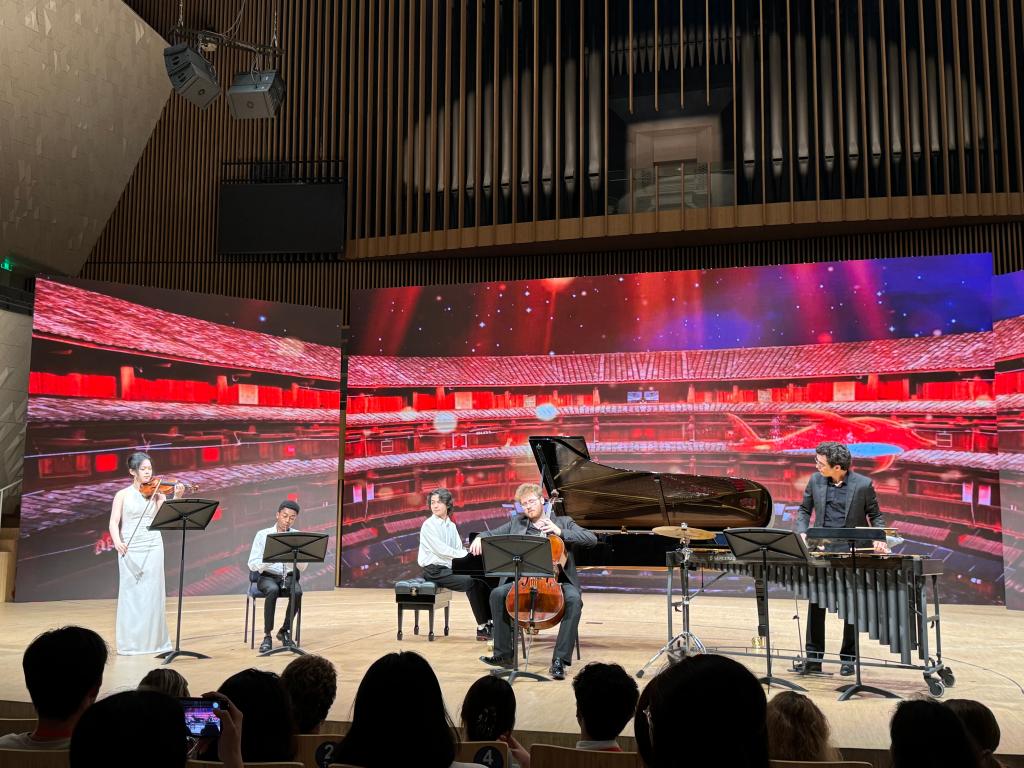 6月27日晚,2024年“鼓岭缘”中美青年交流周专场文艺演出在福州海峡文化艺术中心举行。这是来自美国柯蒂斯音乐学院的学生们在表演管弦五重奏。新华社记者 冯歆然 摄