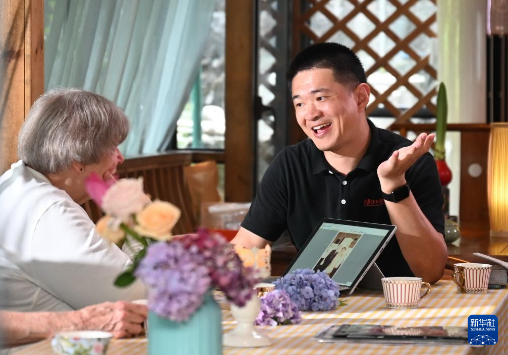 6月21日,林轶南(右)在鼓岭向穆言灵介绍利用“鼓岭家·谱”系统寻找在鼓岭等地生活过的外侨及后代的情况。