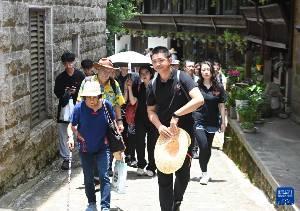 6月22日,林轶南(前右)向回访的“鼓岭之友”介绍鼓岭老街的情况。